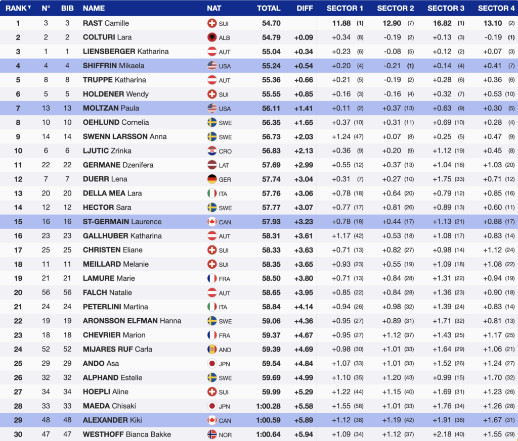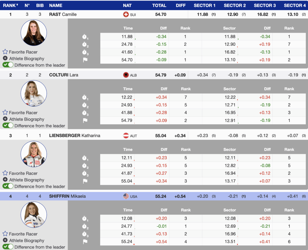 - 4th — Bib 4 — Mikaela Shiffrin — +0.54