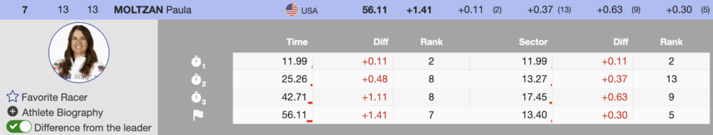 - 7th — Bib 13 — Paula Moltzan — +1.41