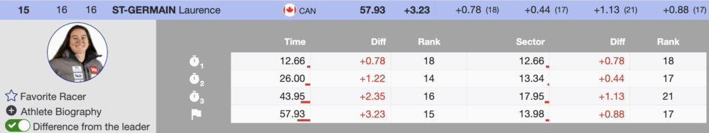 - 15th — Bib 16 — Laurence St-Germain — +3.23