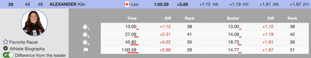 For Alexander, qualifying 29th from bib 48 marked a career milestone — her first World Cup second-run start in 14 appearances, achieved on the most unforgiving first runs of the sport’s history.