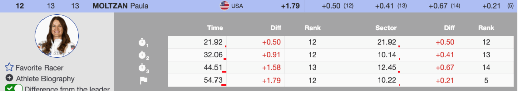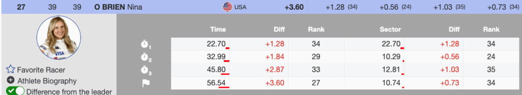 - Nina O’Brien (USA) — Bib 39, 27th, +3.60