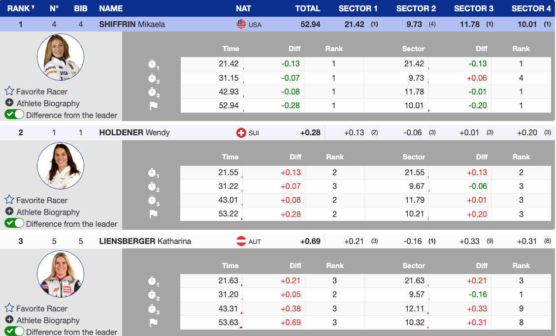 - Mikaela Shiffrin — 1st, 0.00