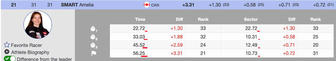 - Amelia Smart (CAN) — Bib 31, 21st, +3.31