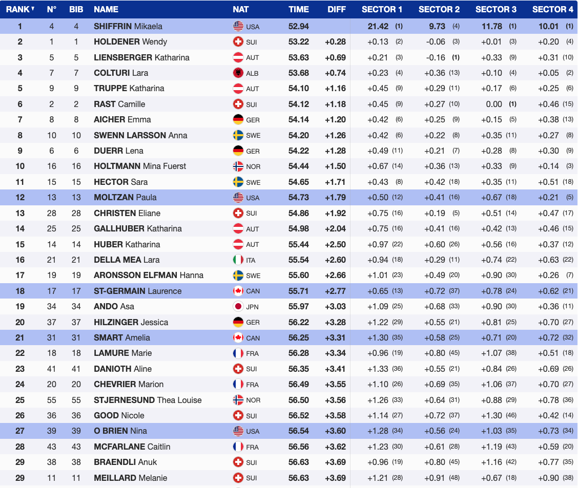 The high bib athletes created one of the biggest stories of the first run, with nine women starting 31 or higher skiing into the top 30 — a rare number in a World Cup slalom.