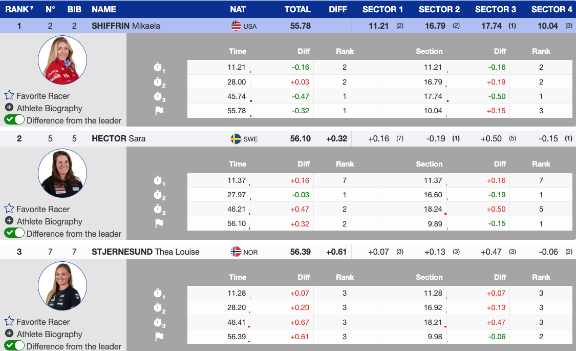 As the morning unfolded, Swiss racer Camille Rast, wearing Bib 18, put down a solid performance to claim fourth place, 0.75 seconds back. By the time the first 15 racers had completed their runs, Shiffrin maintained the lead, followed by Hector and Norway’s Thea Louise Stjernesund in third, 0.61 seconds behind.