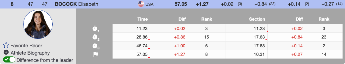 Ten racers with bibs above 30 made the cut for the afternoon. The fastest of them was Bocock, whose stellar run placed her eighth. The last to qualify was Italy’s Giorgia Collomb, wearing bib 54, who secured 20th place. The spread from Shiffrin to the 30th qualifier was 3.47 seconds, underscoring the competitive nature of the field.