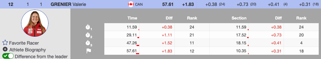 Two-time Kranjska Gora winner Valerie Grenier opened the race with a steady performance, showing promise but falling short of the precision and speed required to challenge for the lead. She ended the morning in 12th place.