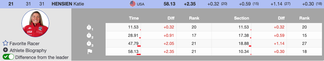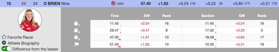 Nina O’Brien added to the U.S. success. Carrying momentum from a strong opener in Sölden, she finished in 10th, 1.62 seconds off Shiffrin’s pace. Meanwhile, Katie Hensien, starting 31st, delivered a solid effort to finish 2.35 seconds back, ending the morning qualifying in 21st place.