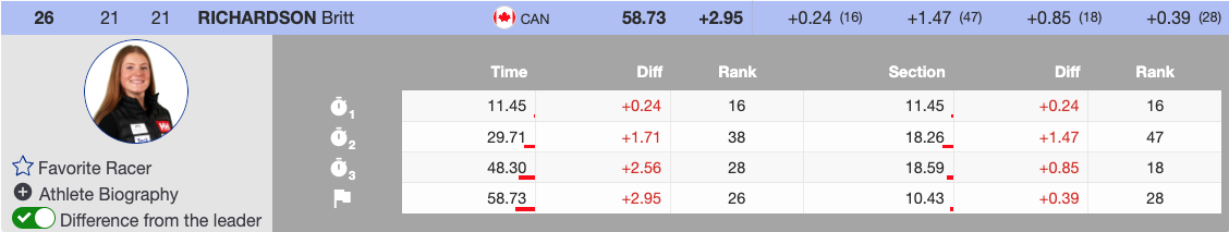 Canada’s Britt Richardson struggled to find her rhythm on the icy course but managed to qualify for the second run, finishing 26th, 2.95 seconds back.