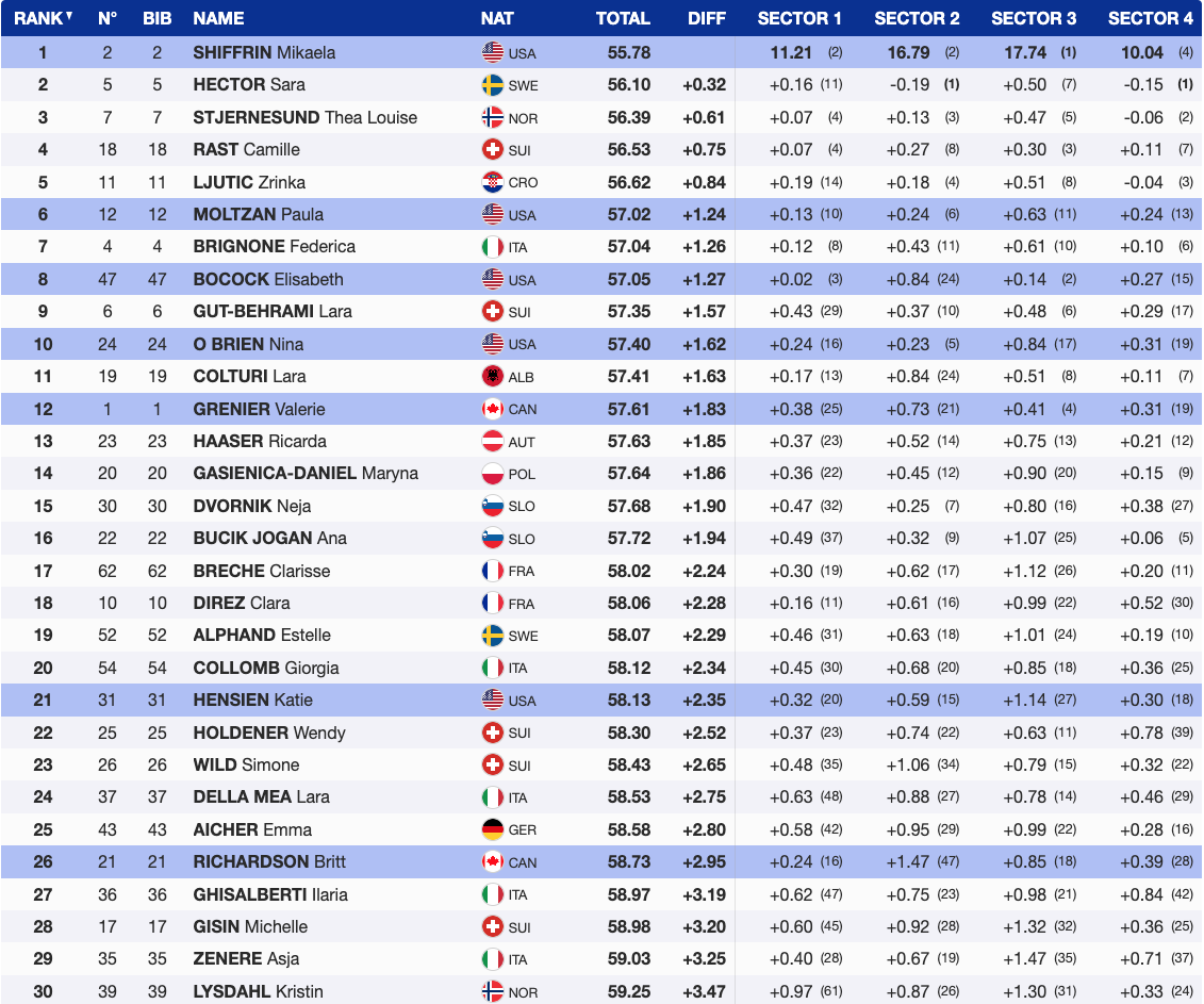 Ten racers with bibs above 30 made the cut for the afternoon. The fastest of them was Bocock, whose stellar run placed her eighth. The last to qualify was Italy’s Giorgia Collomb, wearing bib 54, who secured 20th place. The spread from Shiffrin to the 30th qualifier was 3.47 seconds, underscoring the competitive nature of the field.