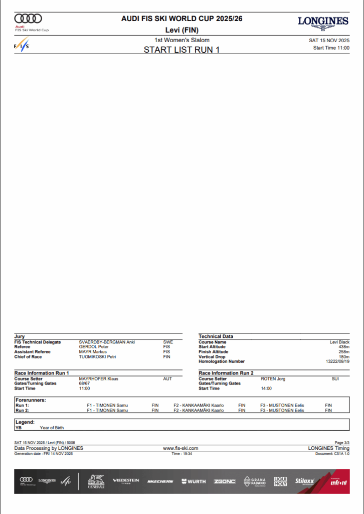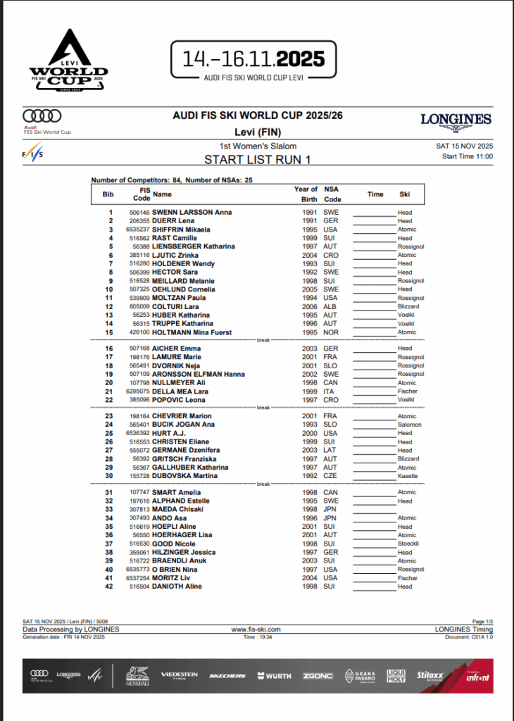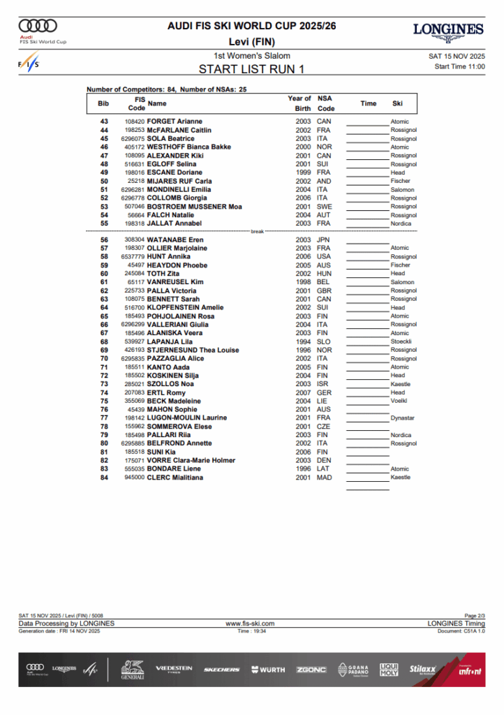 Daily Program Women’s Levi SL Saturday November 15th