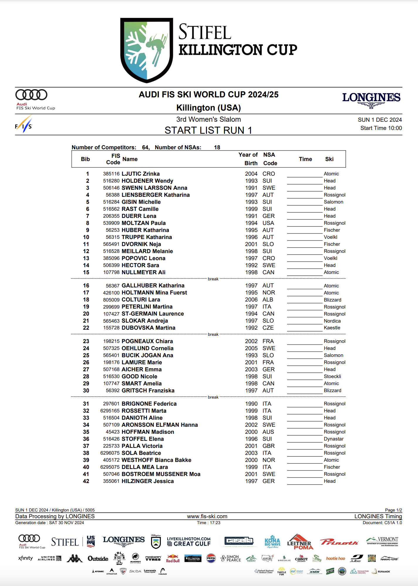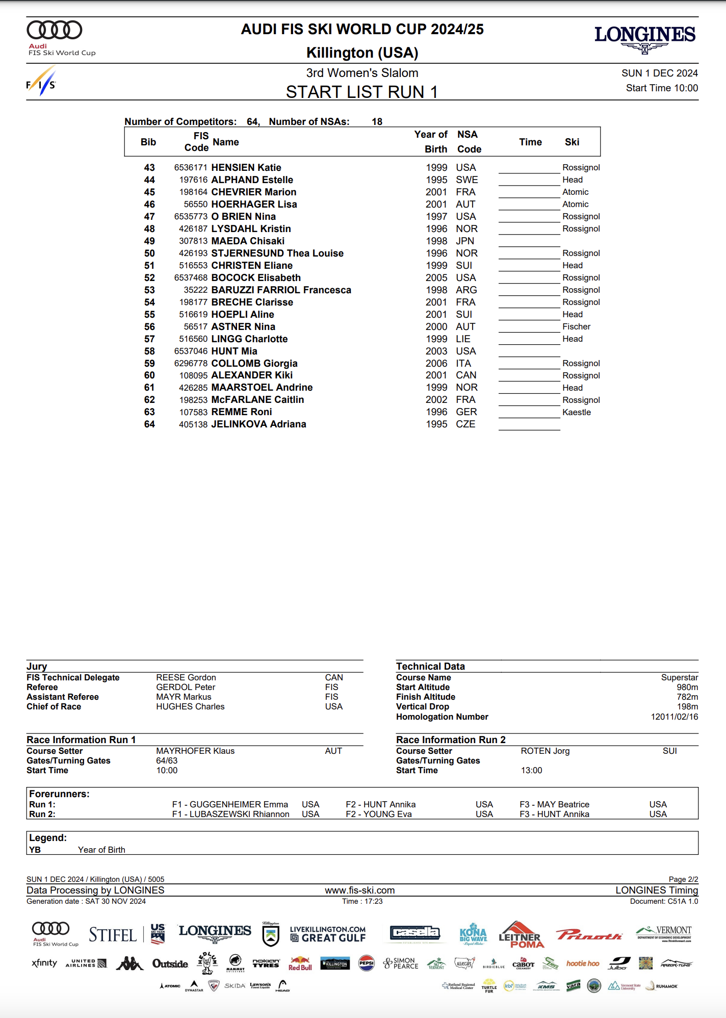 These rising stars bring fresh energy and ambition to the team, with Bocock expanding her World Cup repertoire and Hunt stepping onto the global stage for the first time. On Killington’s challenging terrain, both athletes have the chance to showcase their talent and establish themselves as key figures in the next generation of U.S. ski racing.This determined group rounds out the North American entries, each bringing unique stories and potential to Gürgl’s challenging slalom race.