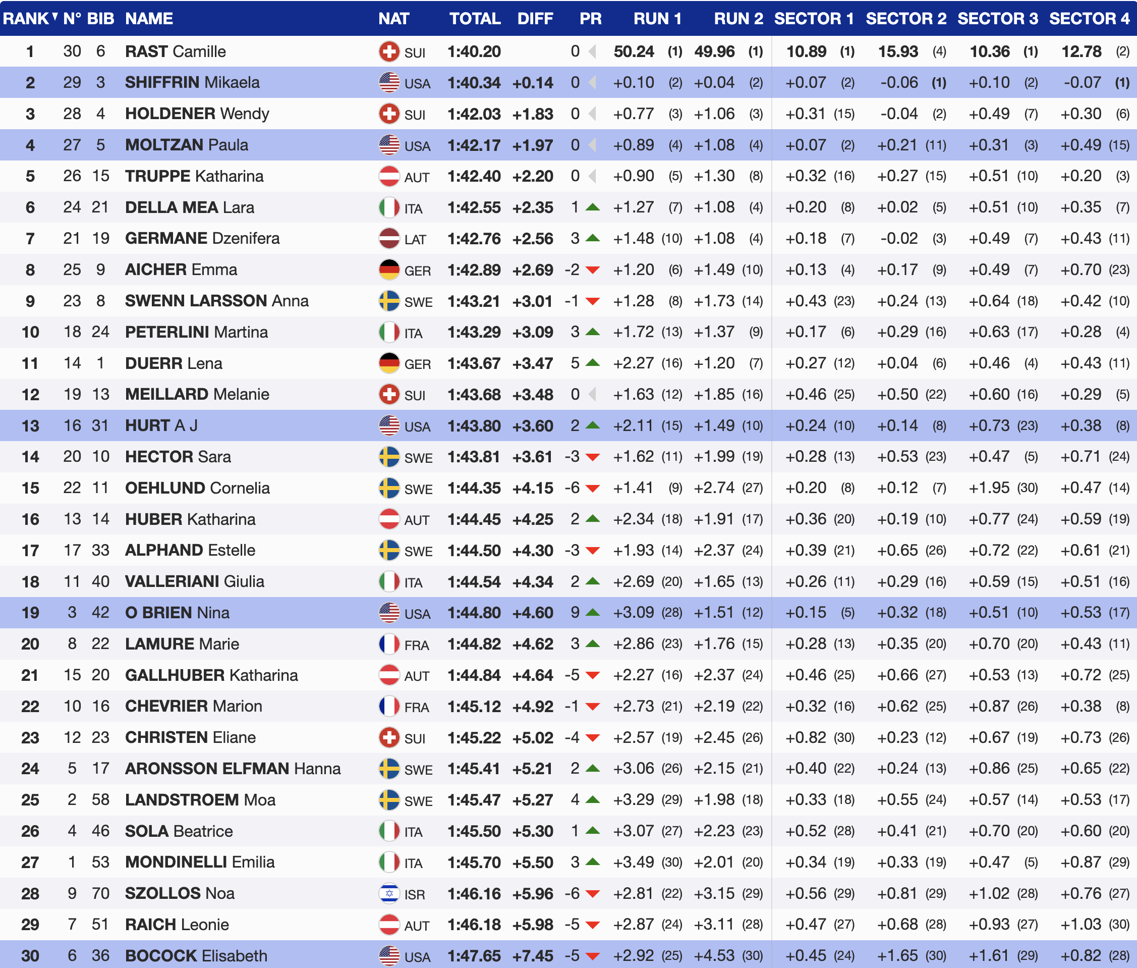 As the first-run leader, Rast skied last and handled maximum pressure with precision and energy. She posted the fastest second run (49.96) to finish in 1:40.20, extending her first-run advantage just enough to deny Shiffrin, who had delivered what she later described as one of her most committed runs of the season.