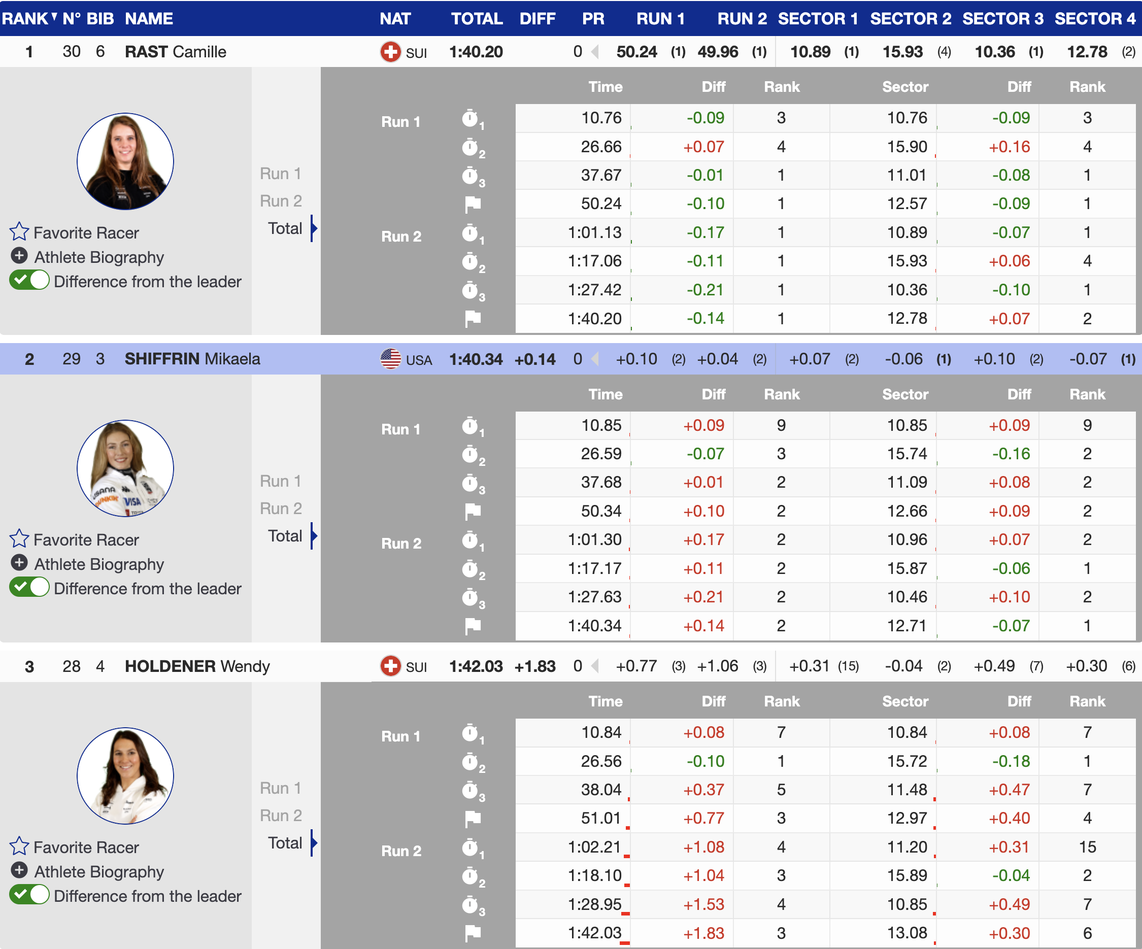 Sector timing backed up her assessment. In fact, she was fastest in the lower sections of the course and lost time only where Rast was exceptional. For Shiffrin, the biggest accomplishment was executing technical details at full speed on an exceptionally fast track.