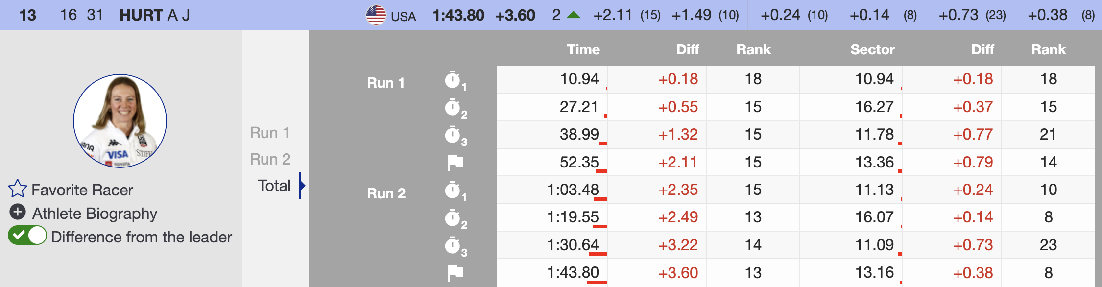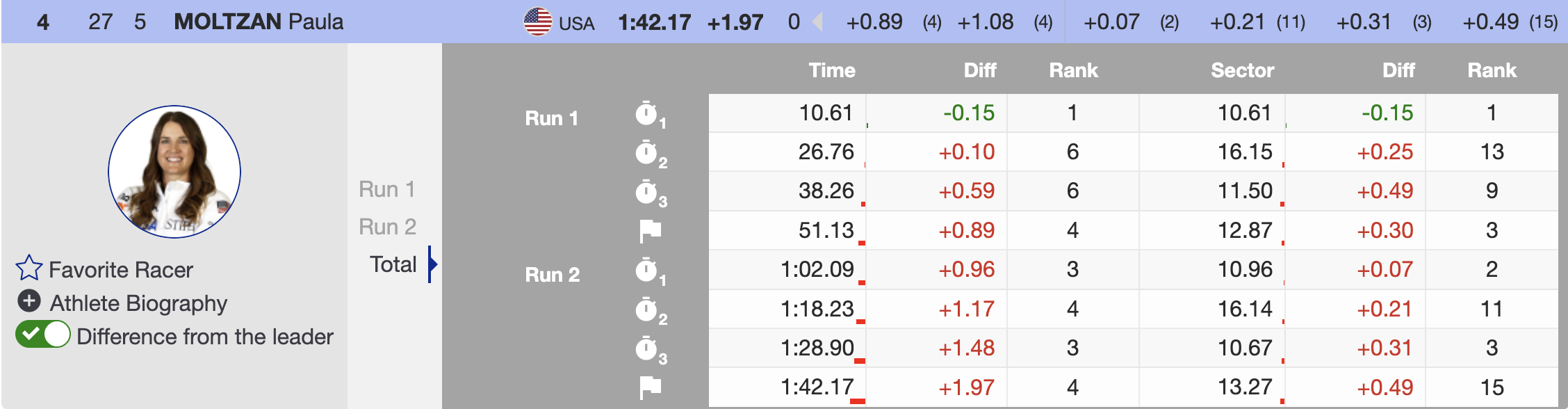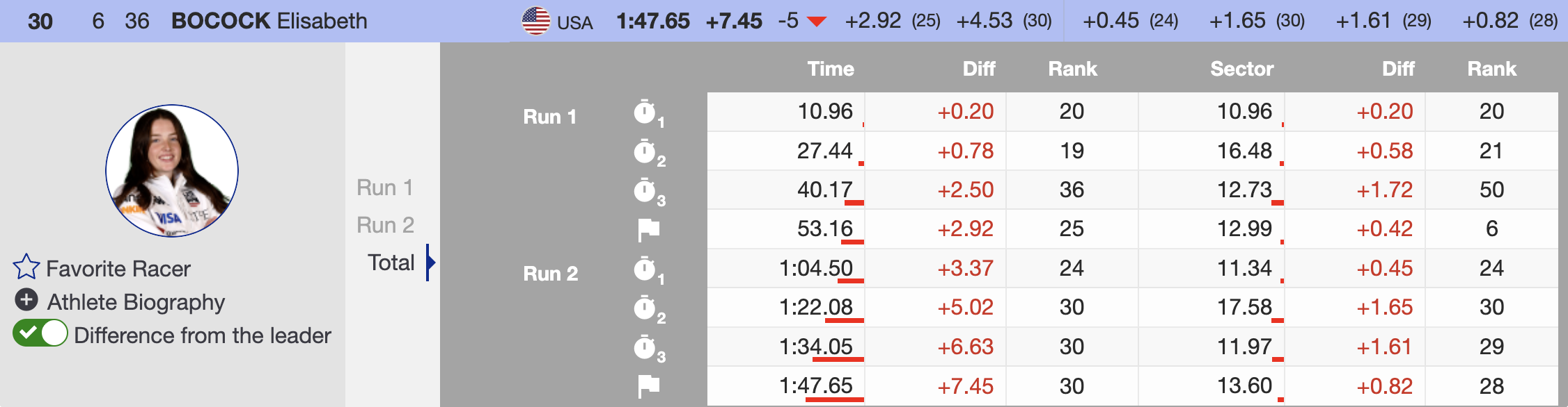 Produced the only significant second-run charge, climbing nine positions after finally bringing the sensations she has felt in training into a race environment. - 30th — Elisabeth Bocock (USA)
