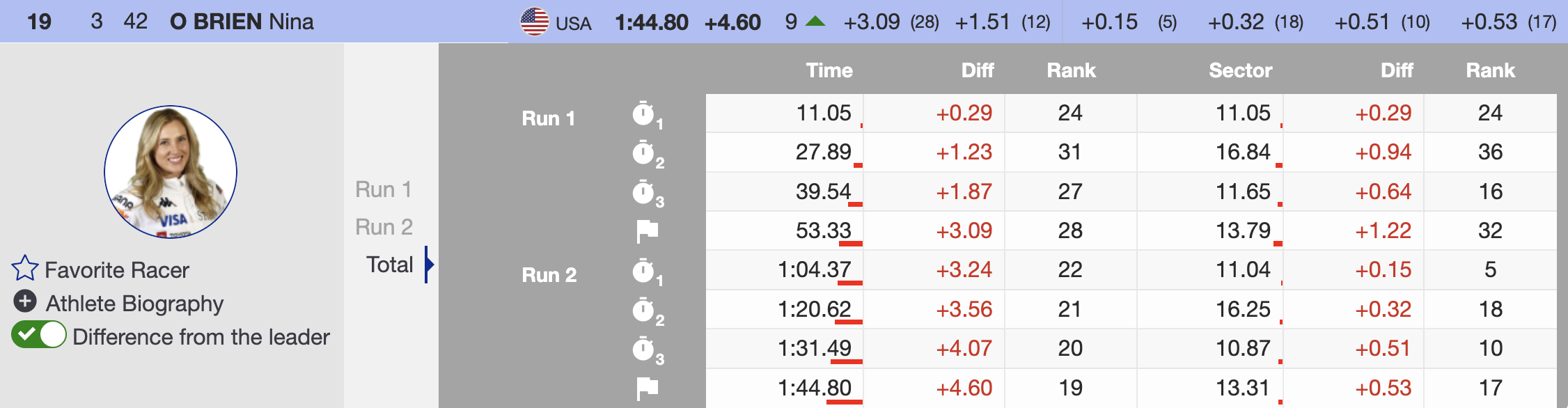 Continued her return from injury with her first World Cup slalom result of the season, saying it felt good to have her solid skiing back and noting she no longer thinks about her hip while in the course. - 19th — Nina O’Brien (USA)