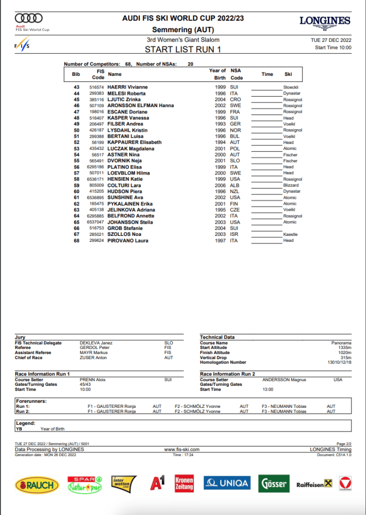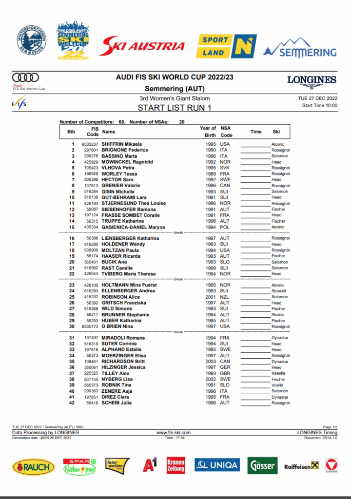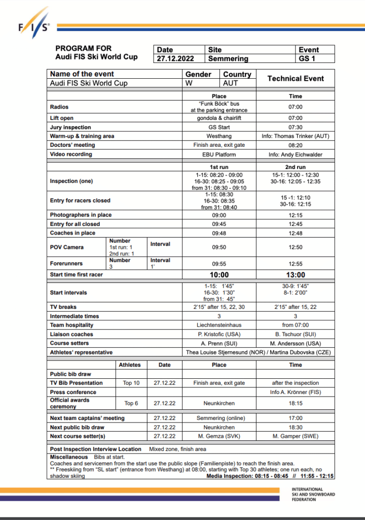 First run start list and program for the Dec. 27th Semmering GS