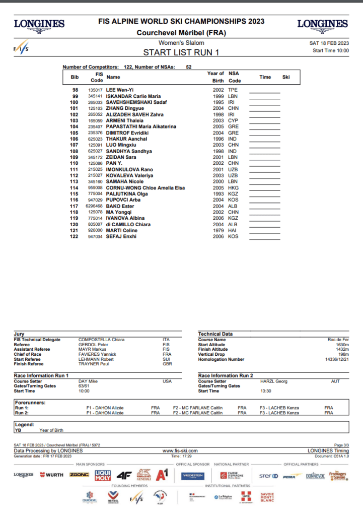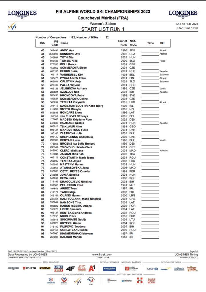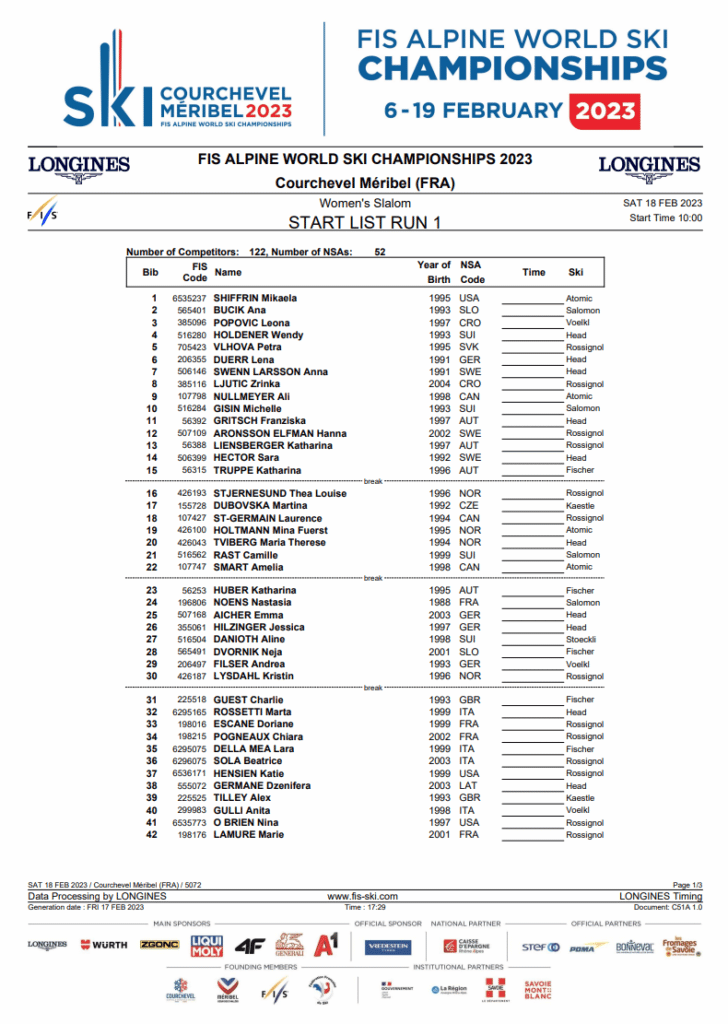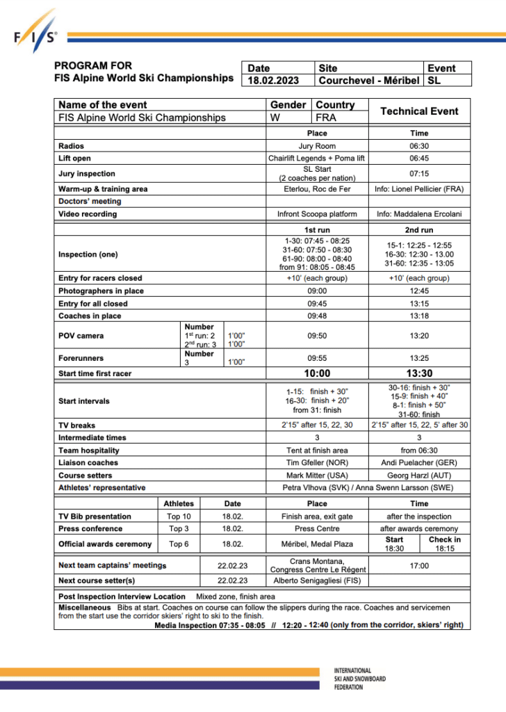 The first run start list and program for the Saturday, February 18th Méribel women’s World Championship SL