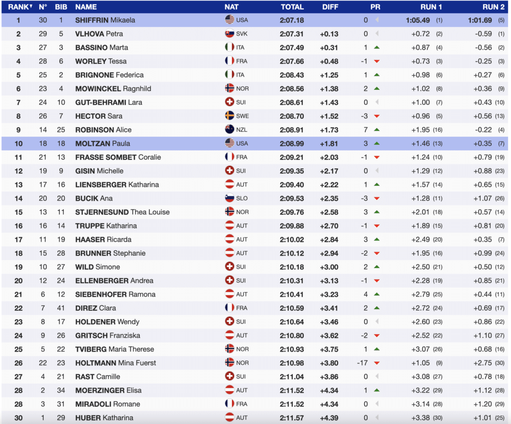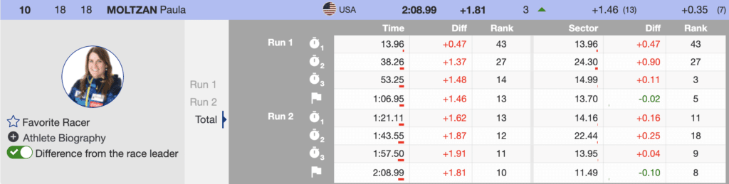 Stifel US Alpine Team member Paula Moltzan had another excellent day. Moving up five spots on the first run, she skied well to move up another three during the second. Moltzan used the seventh fastest final run to finish the race in 10th. She is skiing at a world-class level and is being rewarded with good outcomes whenever she reaches the finish.