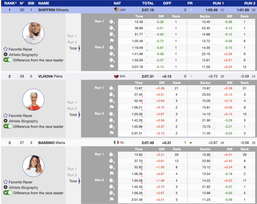 When it came down to the fastest six from the first run, it was clear that the day would reward the brave. A good outcome would come to those willing to commit to the outside ski and arc it as much as possible. In the end, the podium hosted Shiffrin, Vlhova, and Bassino, but it is clear there is considerable competition among the best.