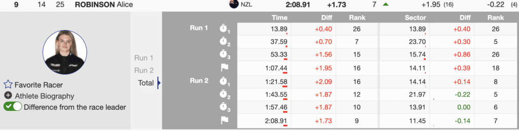 New Zealand’s Alice Robinson showed power and determination and led the group by 0.85 seconds. The former World Cup winner performed at an excitingly high level. With the fourth fastest time of the second run, Robison, who finished the first run in 16th, moved up seven spots before Norway’s Ragnhild Mowinckel took the lead. Robinson finished ninth.