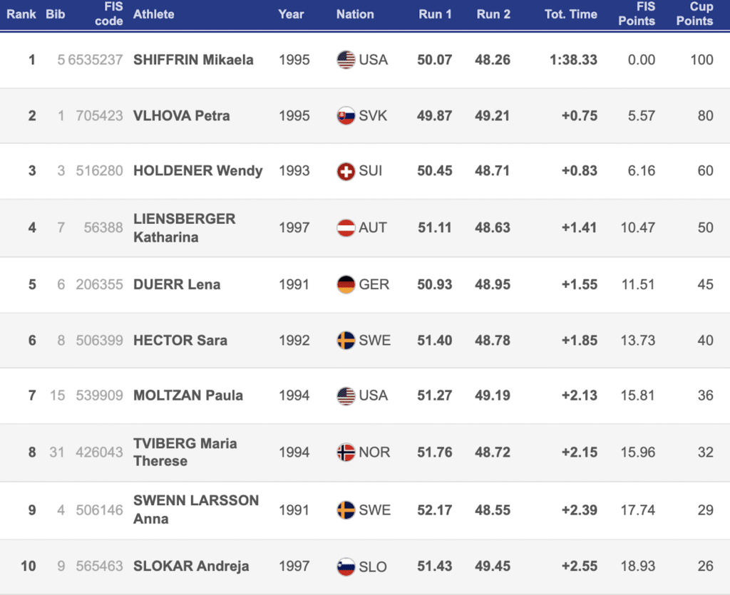 Vlhova also made a mistake, and that cost her even more dearly than Shiffrin’s. The overall champion was almost a second slower than Shiffrin on the second run to ultimately finish .75 behind in second place.
