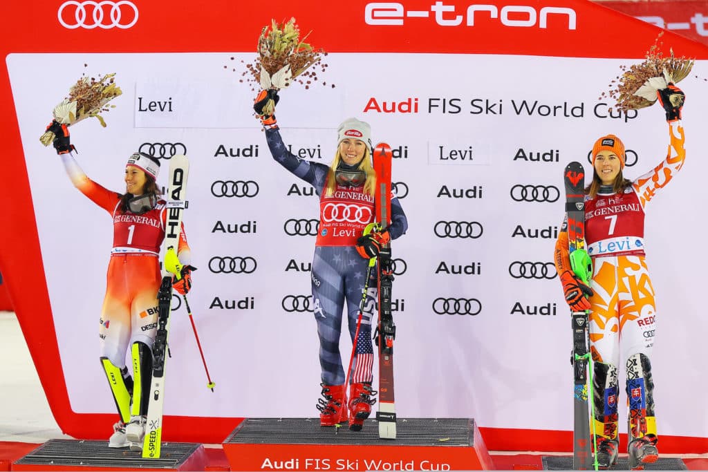 Wendy Holdener of Switzerland finished second capitalizing on a wonderful final run. Their rival, Olympic slalom champion and last season’s World Cup SL globe winner Petra Vlhová of Slovakia was third, matching her result on Saturday, 0.68 slower than Shiffrin.