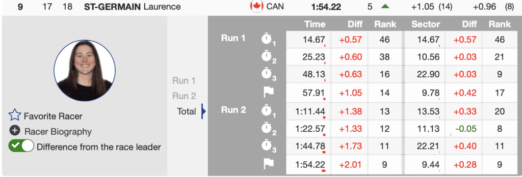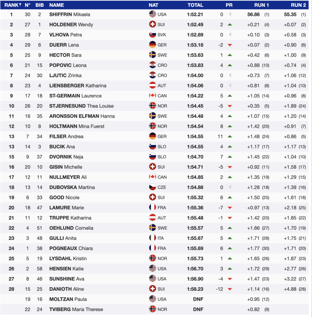 Additionally, Canadians continue to perform. St-Germain skied well and finished 9th, and her teammate finished the series with two solid results, 14th and 16th. Nullmeyer leaves Levi with 32 slalom points and 15th in the standings.