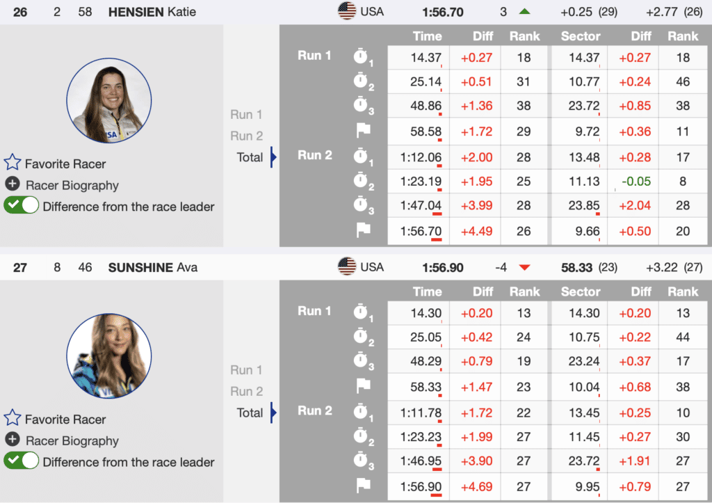 Starting with Katie Hensien, not only did she qualify with bib 58, but after hitting a stone on the second run, she fought to the bottom without ski grip and ended the day 26th. Ava Sunshine not only scored World Cup points in her first two events but after experiencing edge damage, she battled to stay in the course after a significant challenge on the second run.