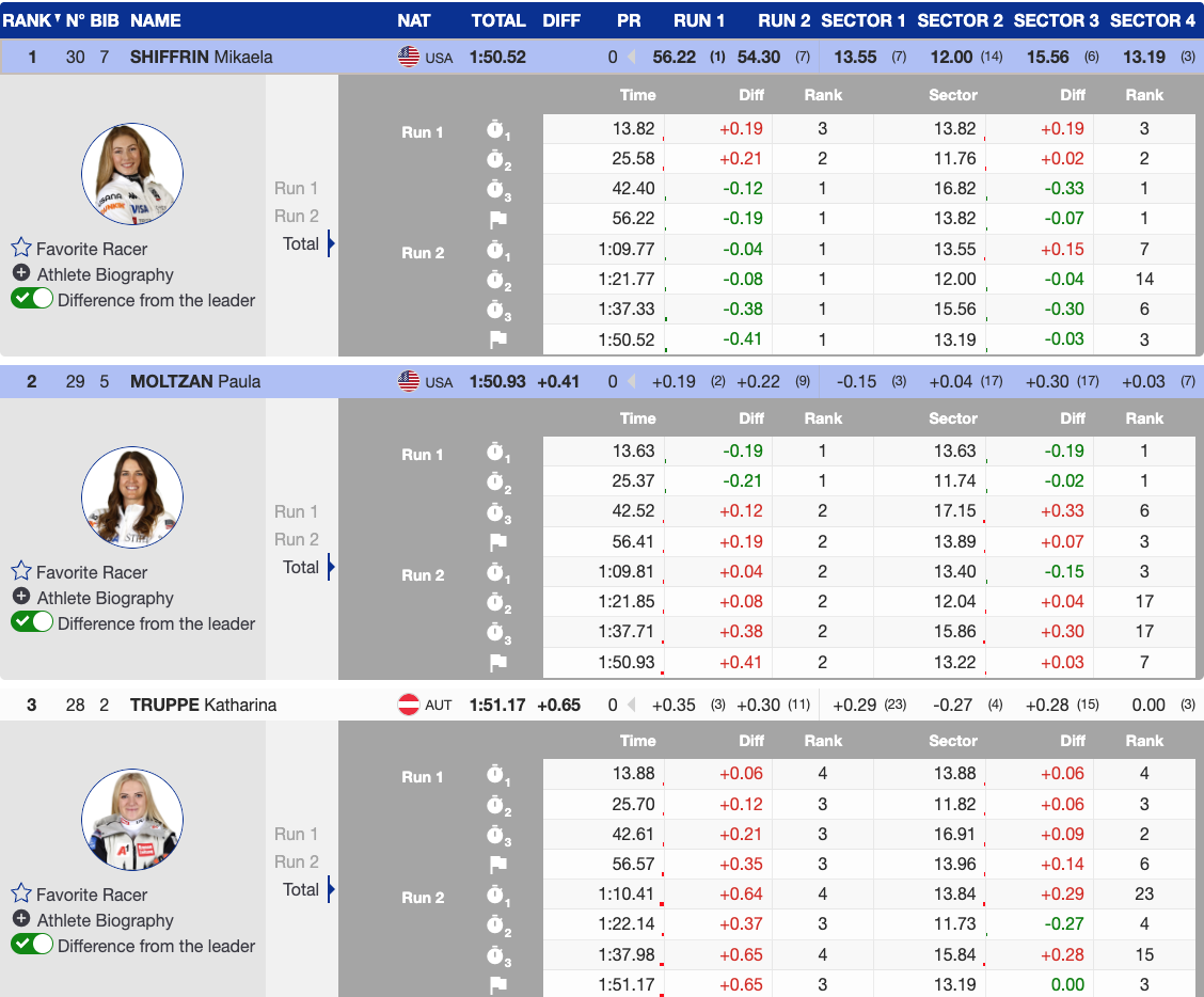 - 1st — 🇺🇸 USA Mikaela Shiffrin — 1995 — Atomic, Oakley — +0.00