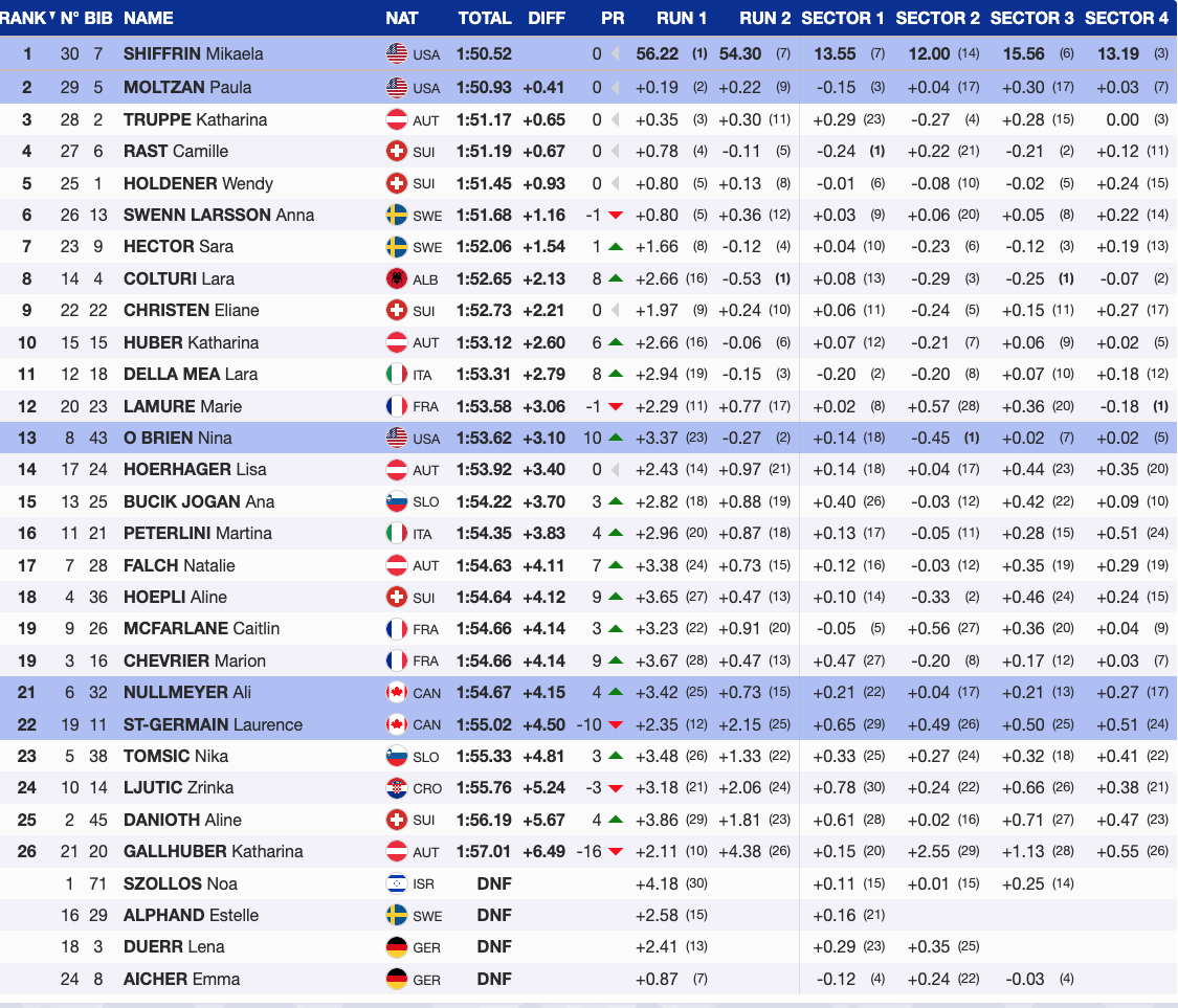 “It was pretty inspiring seeing what Paula and Mikaela were able to throw down in the first run,” O’Brien said. “We’ve talked a lot about our GS speed, but it’s cool to see the slalom speed our team has too.”