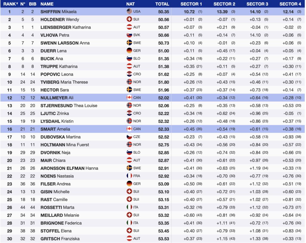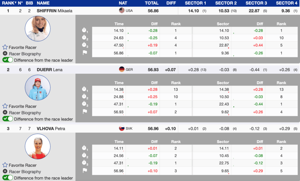 Starting with bib 2, Mikaela Shiffrin arrived at the finish 0.22 ahead of bib one Liendsberger of Austria. Shiffrin never relinquished her lead. She finished the first run 0.21 seconds ahead of Swiss athlete Wendy Holdener. The three athletes are one, two, and three, with a separation of only 0.22 seconds. Slovakian superstar Petra Vlhova is 4th, only 0.31 seconds behind Shiffrin.