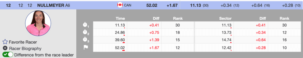 Paula Moltzan continues to struggle to finish. When considering her start number, her splits were excellent. However, she again went out. Unfortunately, the rookie sensation Ava Sunshine also DNFed on the first run. Continuing to struggle to finish slaloms, after a great day of GS, Nina O’Brien did not complete the first run. Joining her three teammates Katie Hensien who has been skiing very well, did not finish. Unfortunately, when AJ Hurt did not finish, it meant Shiffrin would be the only US athlete skiing the second run.