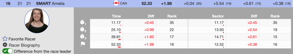 Like the four Americans, bib nine Canadian star St-Germain continues her struggles. Although she fought to the bottom, her mistake meant she did not qualify for the second run. However, her teammate Nullmeyer crossed the finish in ninth place with a good time, considering the course conditions she experienced. Nullmeyer finished 12th in the first run. The University of Denver graduate and ACA member Amelia Smart will race the second run. Skiing very well, Smart finished the run in 16th. This is the first time Smart has qualified for the second run in Killington. She has had five previous Killington starts.