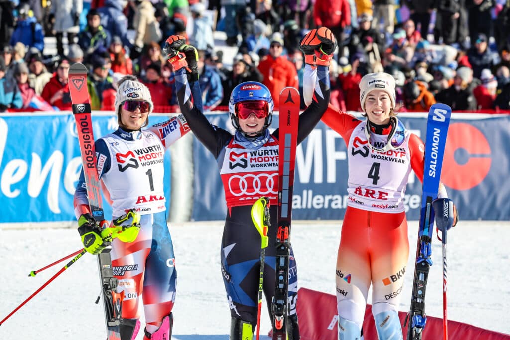 With ten racers remaining, the leader was Germany’s 20-year-old Emma Aicher. She stayed in the leader’s chair until two-time Åre slalom winner Austrian Katharina Leinsberger earned an advantage, but the lead changes did not end there. The only skier not named Shiffrin or Vlhová to win a slalom this season was next to earn the lead. Sweden’s Anna Swenn Larsson still held that lead with four races remaining. But that racer was Germany’s Lena Dürr. She took a narrow lead of (-0.01) with three skiers still to race.