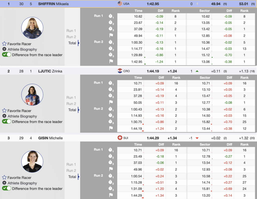 However, those were the best three from the initial run. Twenty-year-old Croatia’s Zrinka Ljutic assumed the advantage with only two remaining at the start. Then, the next racer, Switzerland’s Michelle Gisin, crossed the finish line one position behind the Croatian, and both women knew they had earned spots on the podium. But Shiffrin had yet to race. Shiffrin delivered the fastest run in both courses and won the race by an amazing (1.24).