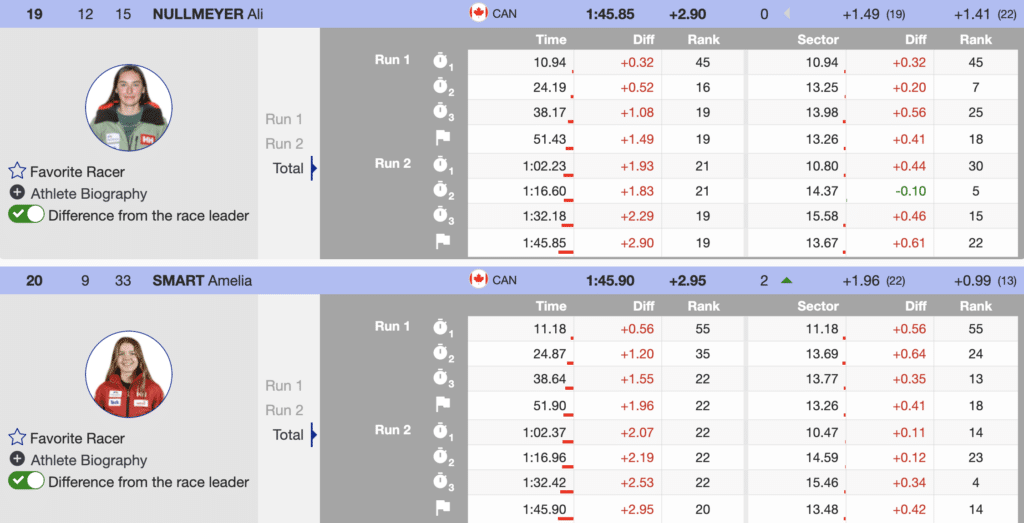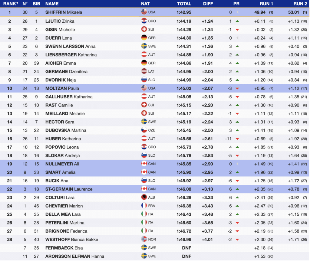 The last Canadian to ski was the Canadian slalom leader Ali Nullmeyer, who finished 19th (+2.90) but easily qualified for the World Cup slalom final next week.