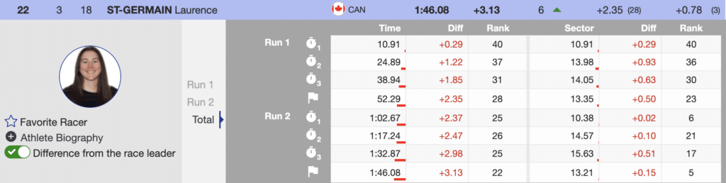 The earliest three North Americans to race were all Canadians. The first to ski was St-Germain, and she delivered the best run of her season. Using the third-fastest second run, she moved up six positions to finish 22nd (+3.13) but missed the finals by one spot.
