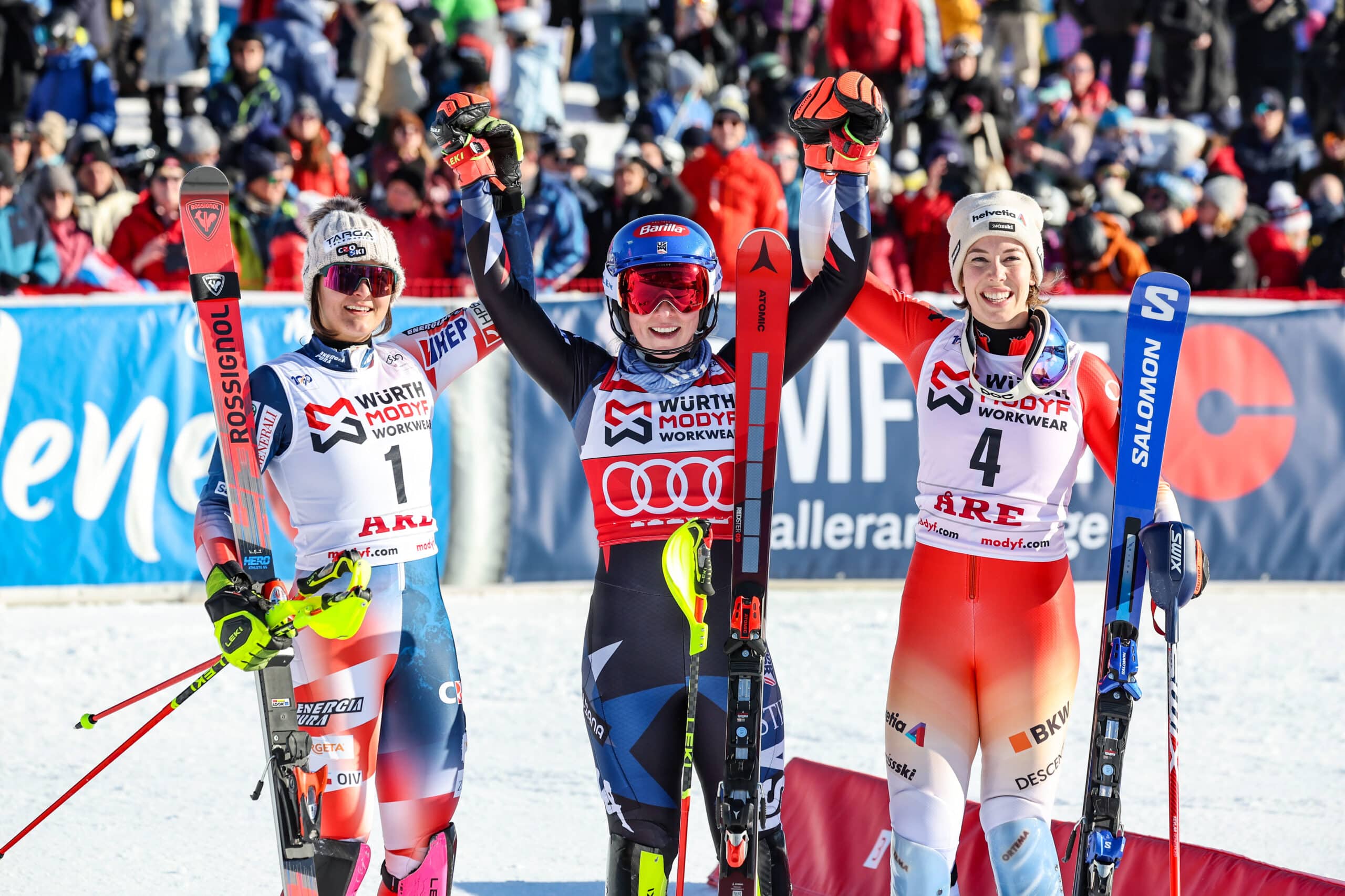 Gisin said, “It’s been an incredible slalom season—I would never have thought of that, but I’m very glad. I was very lucky today, with Lena and Anna being so close behind.