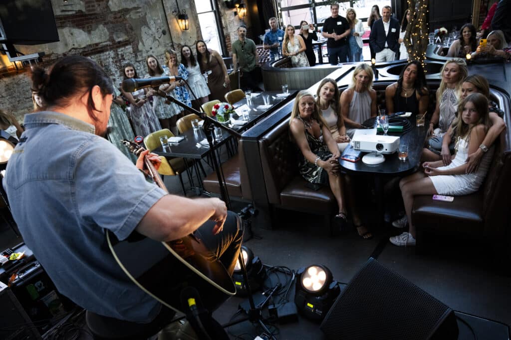 Instead, the conspirators had hatched a plan to turn it into a giant surprise celebration for Eileen’s birthday and Mikaela’s successful season. They even arranged a live musical performance by Noah Kahan. A tremendous loving crowd greeted the two women as they entered the venue. Not only were the beloved longtime friends and teammates present, but also valued partners, like USSS’s CEO Sophie Goldschmidt and close friend Stifel CEO Ron Kruszewski.