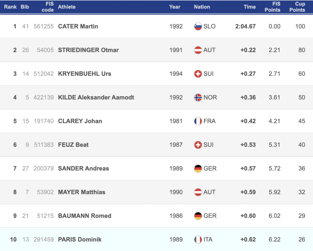 Both Striedinger and Kryenbühl must have earlier thought victory was theirs, and both had taken part in a brief victory ceremony that World Cup organizers always stage after the top-30 downhill racers complete their run.