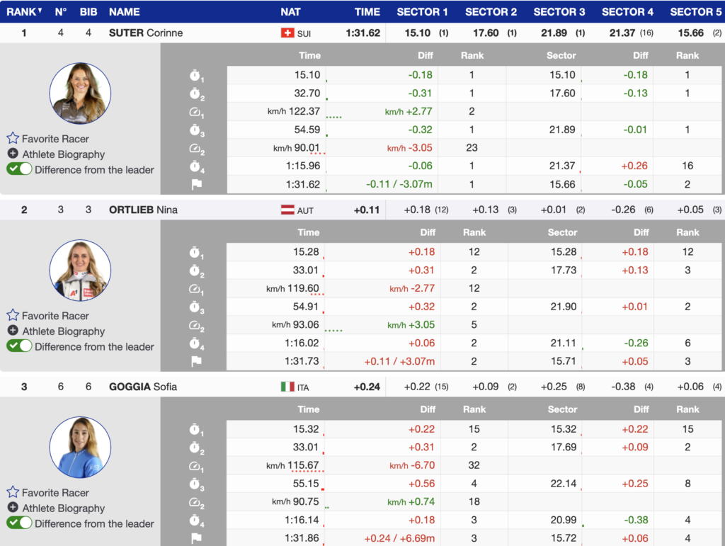- 1st — Bib 4 🇨🇭 Corinne Suter (SUI, 1994, Head) — 1:31.62
