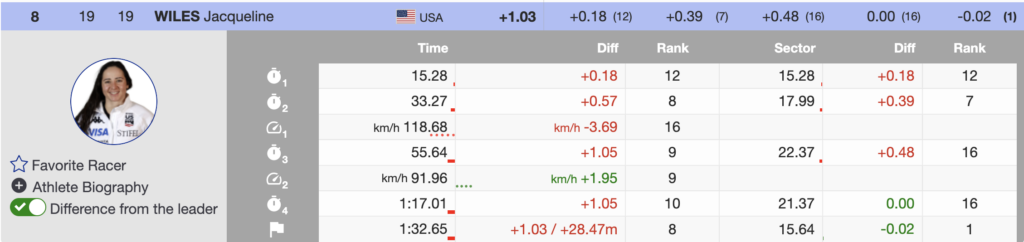 - 8th — Bib 19 🇺🇸 Jacqueline Wiles (USA, 1992, White Pass Ski Club) — +1.03