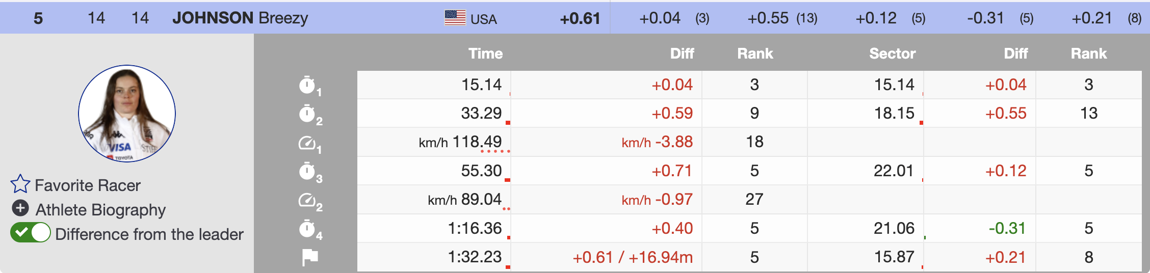 - 5th — Bib 14 🇺🇸 Breezy Johnson (USA, 1996, Rowmark Ski Academy, Atomic) — +0.61