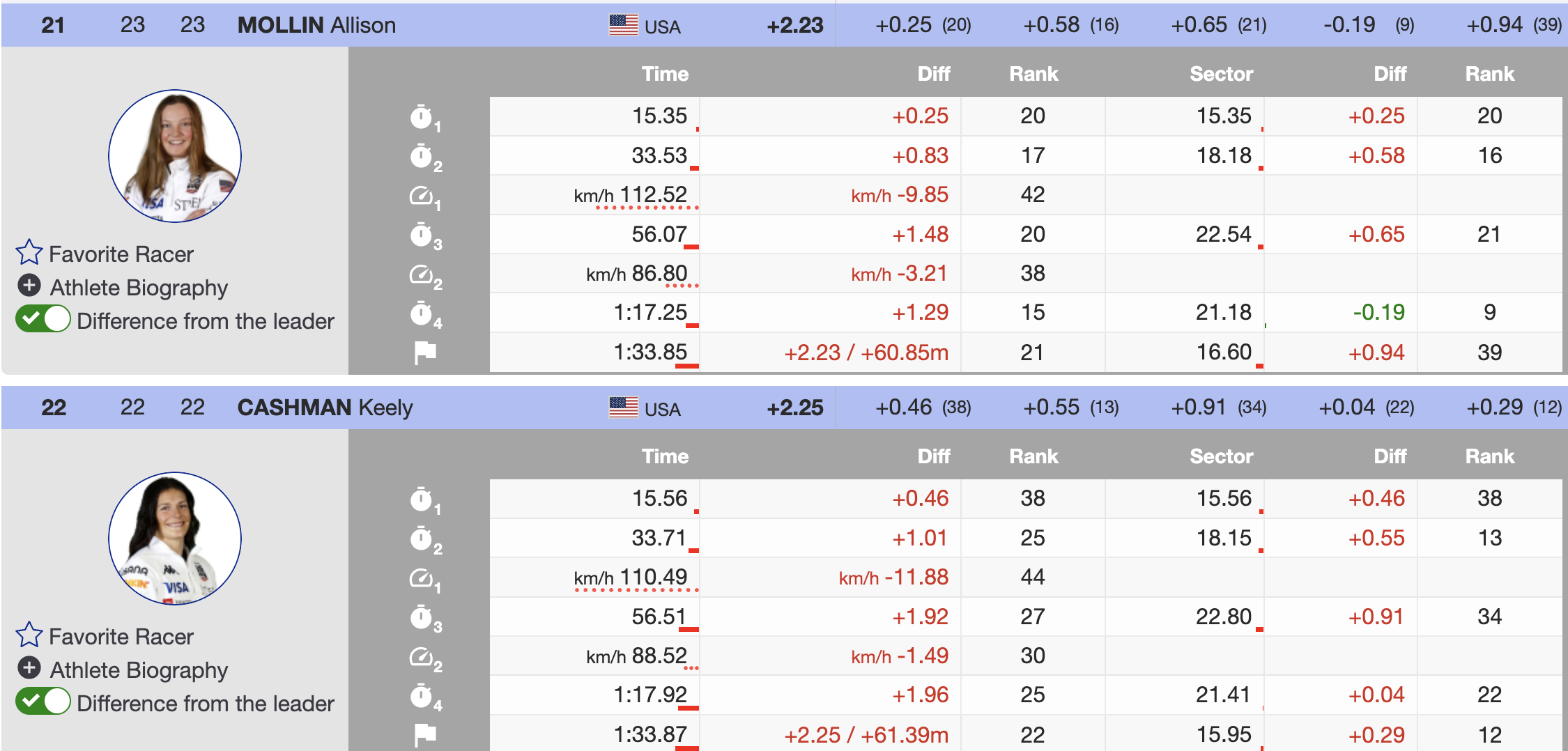 - 21st — Bib 23 🇺🇸 Allison Mollin (USA, 2004, Team Palisades Tahoe, Head) — +2.23
