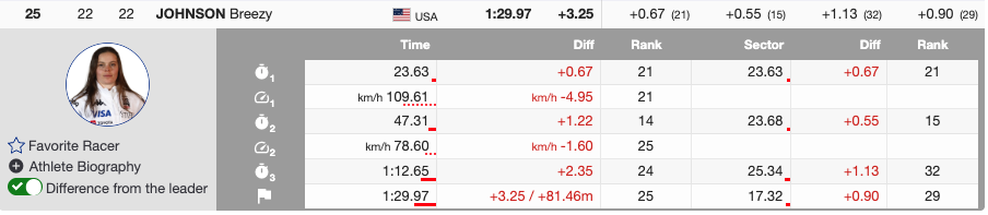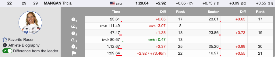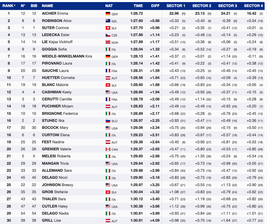 - 29th — Bib 54 🇮🇹 Nadia Delago (ITA) — +3.89
