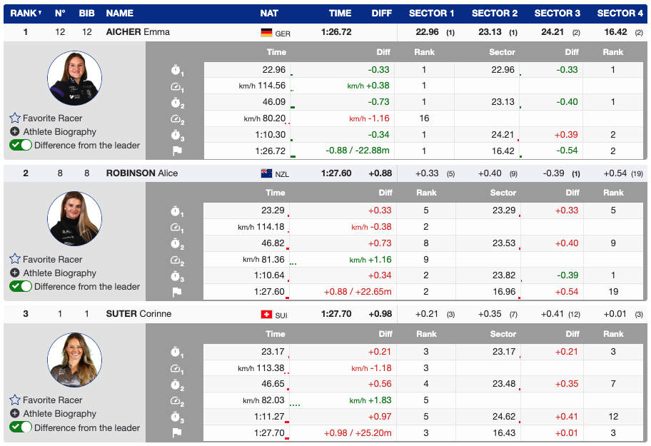 - 3rd — Bib 1 🇨🇭 Corinne Suter (SUI) — +0.98