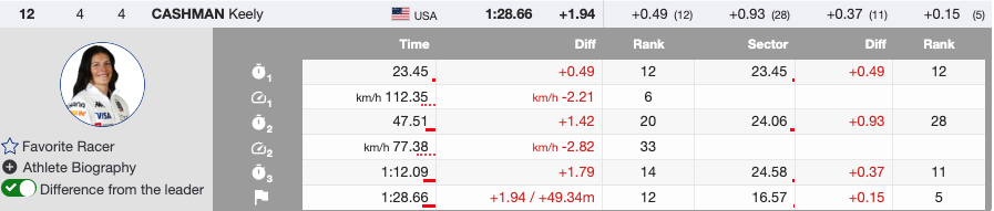 Keely Cashman led the way for the Americans, finishing 12th from bib 4. She came out of the gate with intent and looked ready to attack, but a few small mistakes throughout the run prevented her from fully capitalizing on her speed. At times, she was knocked slightly off her optimal line, disrupting her momentum and limiting her top-end pace.