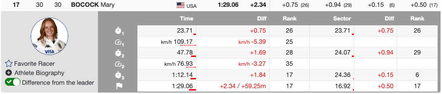 Mary Bocock was one of the standout performers of the day, charging from bib 30 to an impressive 17th place. She showed strong skiing, particularly in the technical section, where she clocked the sixth-fastest split. That strength through the turns allowed her to maintain speed all the way to the finish.