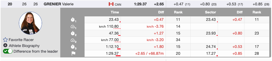 Valérie Grenier represented Canada with a steady and determined run, moving from bib 26 into 20th place. She kept her skiing consistent throughout the course, managing the demanding terrain with composure. While she was slightly more open in her areodynamics at times, she maintained good momentum and handled the bigger features with confidence. She took a huge jump up top, showing bravery and control in the air before smoothly reconnecting with the snow and continuing her charge. On a challenging Super G track, Grenier delivered a solid performance and continued to show her strength in the discipline.